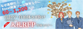| 11 | 官公庁・自治体さま向け「失敗しない入札RFP作成セミナー」 | 本企画は、一般競争入札における「システム調達」で高額化をまねく背景・構造をはじめ、見積り積算にあたり開発会社が必要とする情報とは何か、など「RFP(提案依頼書)」作成のポイントについて、解説いたします。 |