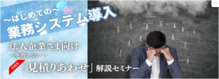 | 12 | はじめてのシステム導入「失敗しない見積りあわせ」解説セミナー | 本企画は、「業務システム導入」する際、システムに精通していない方が、窓口を行う際に、知っておいて欲しい「失敗しないためのコツ」について、わかりやすく解説いたします。 |