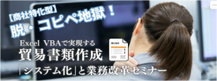 | 13 | 【商社特化型】脱・コピペ地獄!Excel VBAで実現する貿易書類作成の「システム化」と業務改革セミナー | 商社さまにおける日々の「輸出書類」作成では、頻度の高い「コピペ繰り返し」は「入力ミス」をもたらす大きな要因となり、生産性を低下させてしまいます。本セミナーでは、効率的な書類作成のポイントについて解説いたします。 |
