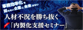 | 14 | 事務効率化を図らない企業に未来はない!人材不況を勝ち抜く「内製化支援セミナー」 | 私たちは今、長引く不況に加え、深刻な人手不足という二重苦の時代に直面しています。厳しい市況下で生き残るには、業務の効率化、労働生産性の向上が企業の最重要課題であることは、皆様が痛感されていることでしょう。 本セミナーでは、人材難・人材不況を勝ち抜く為の企業競争力の向上について解説いたします。 |