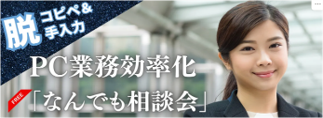 | 15 | 脱コピペ&手入力「PC業務効率化」なんでも相談会 | ご存知でしたか。経理や営業事務など、PC業務における大半が「定型作業」である事実。「労働生産性」を高めるためにできることは、高額コストを伴うIT活用だけではありません。 まずは目前の「コピペ繰り返し」や「手入力」などに着目し、できることからはじめませんか。 |