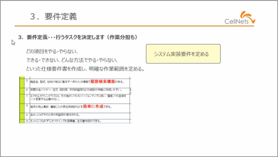 たとえば「ボタンひとつで売上集計表ができるようにしたい」となると、「それに必要なマスターはあるんでしょうか?」「なければ作れるんでしょうか?」「商品マスターの点数だけで数万商品となると現実的には難しくありませんか?」など、要望をどういう方法で実現するかも含めて、「できる・できない」、「条件付きでできる」など、システム開発の実装要件レベルで定めていく必要があります。